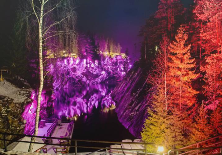 В Рускала едут за чарующими, фантастическими пейзажами карельской зимы и магией мраморных скал, за долгими прогулками по живописным эко-тропам среди чарующего карельского леса и возможностью спуститься в таинственные пещеры и штольни, сделать селфи на фоне Мраморного каньона в сказочной подсветке или даже пролететь над каньоном на зип-лайне, за воспоминаниями и впечатлениями на всю жизнь! В Рускеала начали выламывать мрамор еще в 1769 году, по указу Екатерины II, для украшения самых величественных храмов и дворцов Санкт-Петербурга: Мраморного дворца, Исаакиевского собора, Мариинского дворца. Рускеальский парк – это поражающие каньоны и хрустальные озера, лабиринты подземных штолен и живописные отвесные мраморные скалы. Зимой озеро в каньоне замерзает, и на его поверхности из чистейшего льда вырезают огромные ледяные скульптуры. Кстати, каждую зиму в каньоне Рускеала проводят фестиваль ледяных скульптур. На территории парка работает несколько кафе, в которых можно перекусить блюдами карельской кухни и попробовать очень вкусную выпечку, а в сувенирной лавке можно приобрести изделия местных мастеров из мрамора и другие карельские сувениры.
